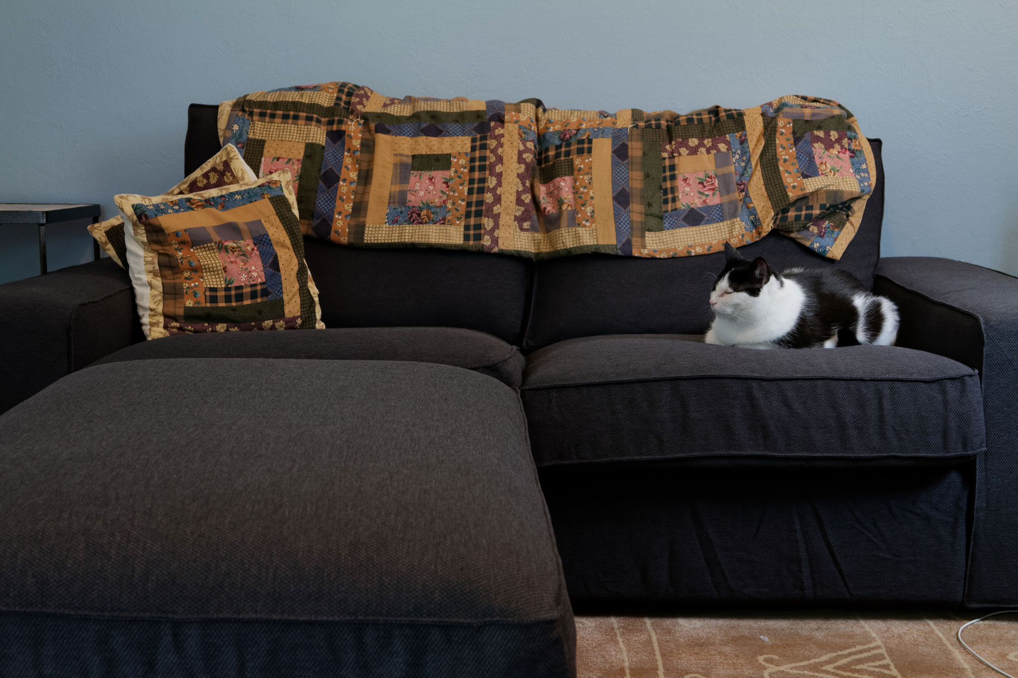 I’ve been trying to figure out how to re-arrange my office to be able to both have something large enough for Ellie to curl up beside me, yet where I could still recline so that Scout and/or Sam and occasionally Emma could curl up on me as well. A visit to Ikea this weekend appears to have solved the problem. This Kivik loveseat is big enough for Ellie & me, while the footstool on the left is big enough that I can recline on it and the cats can sleep on me as before.